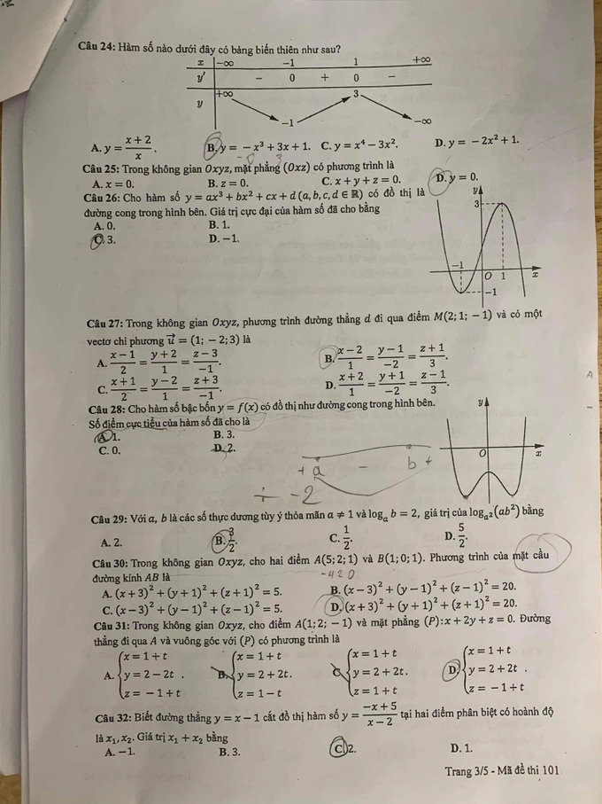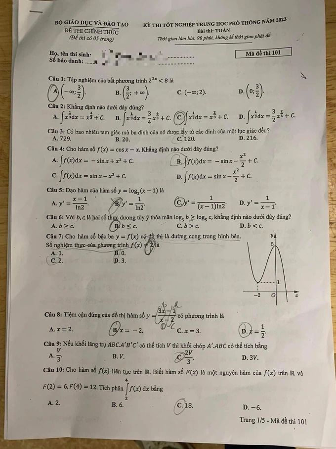 Đáp án môn toán thi tốt nghiệp THPT 2023 - mã đề 101