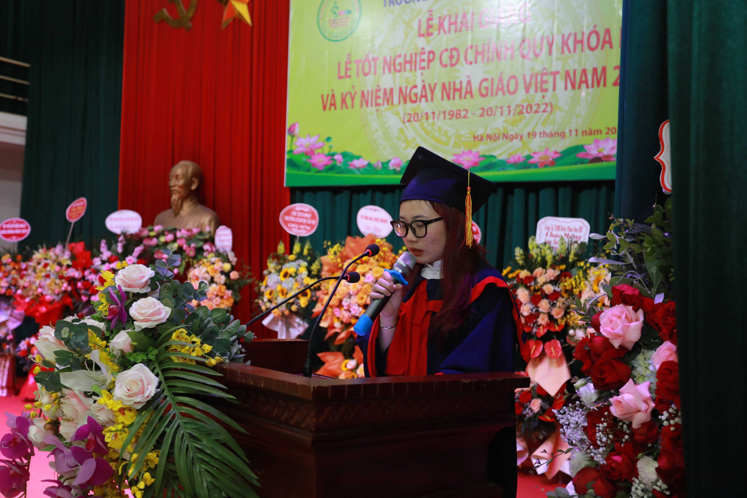 Thay mặt cho các Tân cử nhân cao đẳng chính quy khóa 5- sinh viên Ngô Thị Thúy Hằng K5 Khoa Dược đã xúc động phát biểu lời tri ân sâu sắc tới các thầy cô đã tận tình chỉ bảo, động viên, dạy dỗ và giúp đỡ đầy yêu thương trong suốt 3 năm học qua và xin hứa sẽ không ngừng cố gắng, không ngừng nỗ lực để hoàn thiện bản thân, góp phần xây dựng hình ảnh Trường cao đẳng Dược Hà Nội trên chặng đường sắp tới.