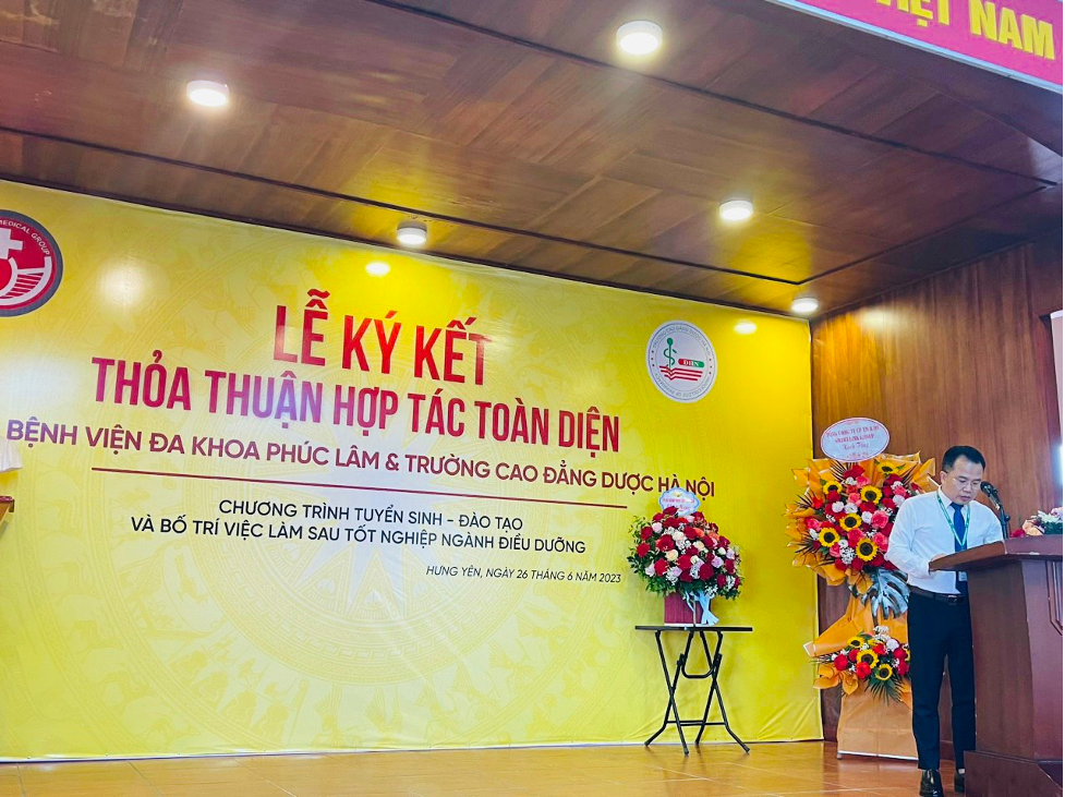 Ảnh: Ths.Đường Xuân Tùng, Hiệu trưởng nhà trường phát biểu trong buổi lễ ký kết với Tập đoàn bệnh viện đa khoa