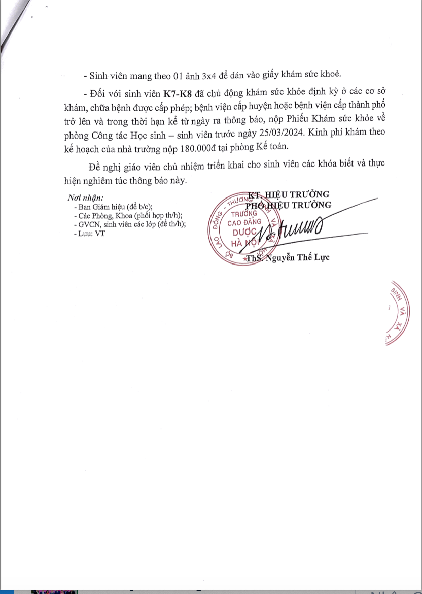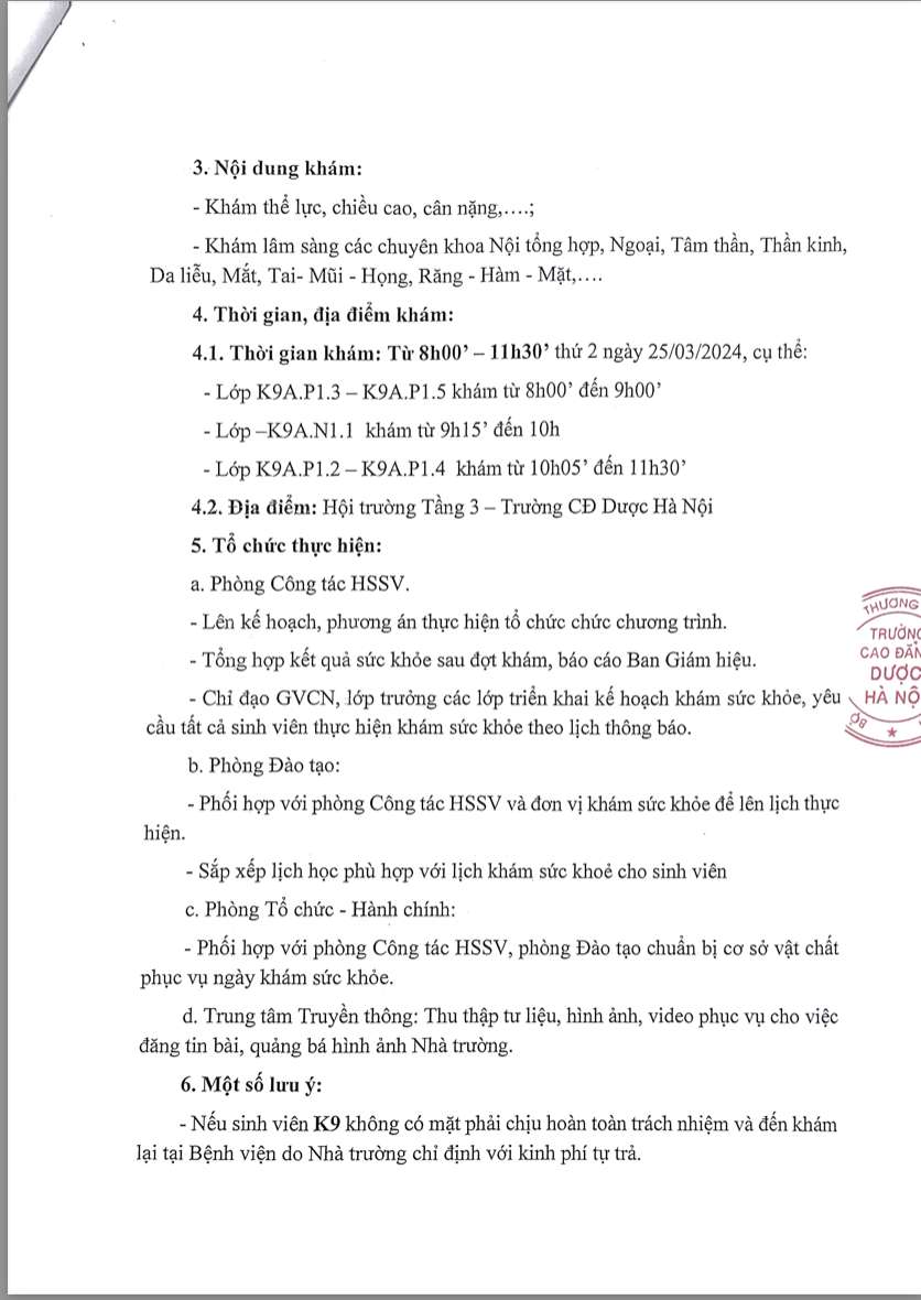Thông báo về việc tổ chức khám sức khoẻ cho sinh viên Trường Cao đẳng Dược Hà Nội năm học 2023-2024Thời gian: từ 8h00' đến 11h30' thứ 2 ngày 25/03/2024 Địa điểm: Hội trường tầng 3-Trường Cao Đẳng Dược Hà NộiĐường XP2 + 150m, Đường Xuân Phương, Q. Nam Từ Liêm, TP.Hà Nội Chia sẻ: